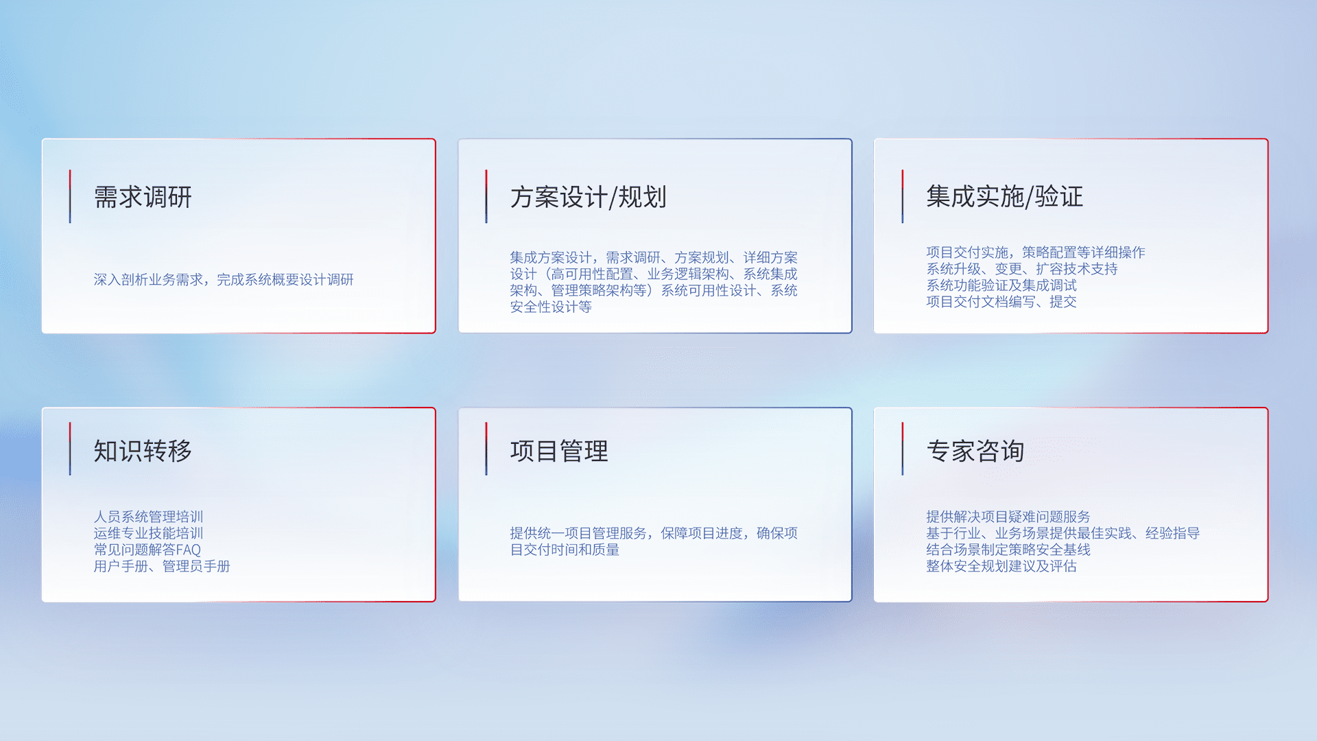 针对客户行业特性,,将宏观的安全战略和需求,,,,通过专业的交付服务,,,,实现项目落地,,为客户提供标准规范的集成交付服务。。。